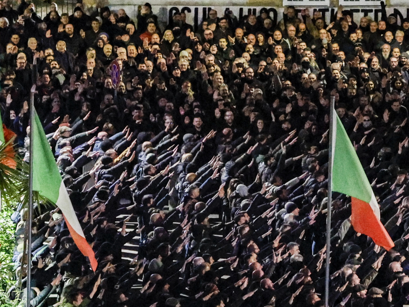 Il grido con i nomi delle vittime della strage di Acca Larenzia a Roma. Il presente ripetuto tre volte, col saluto romano.