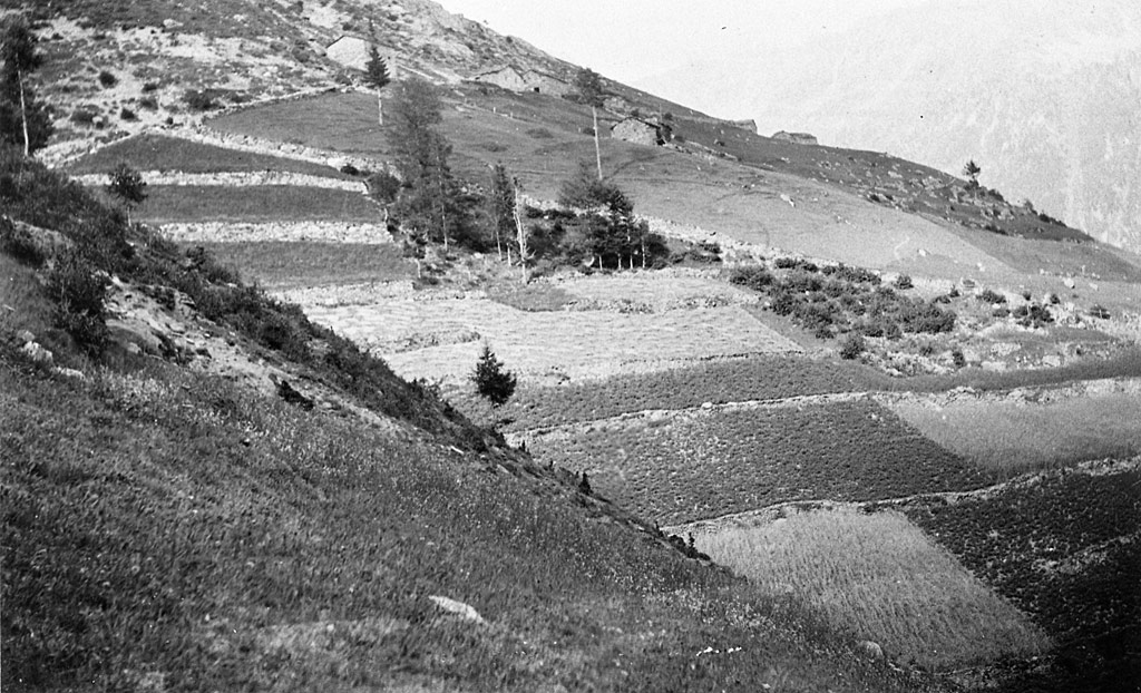 Ampi appezzamenti erano coltivati a campi, contrade di Gandöi e di Paganin, Cavaione, 1902 (archivio fotografico Luigi Gisep, Poschiavo)