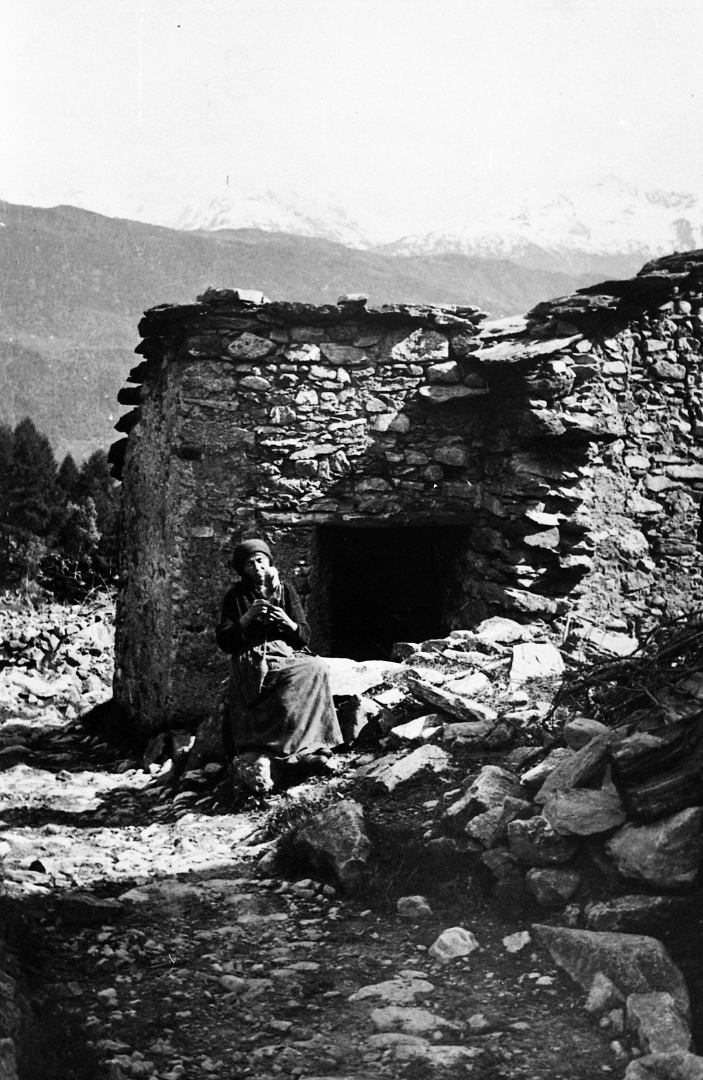Una donna impegnata nella filatura della lana, tra Viano e Baruffini, 1940. (fotografo: Domenic Gisep, ex guardia di confine a Viano, archivio fotografico Luigi Gisep, Poschiavo)