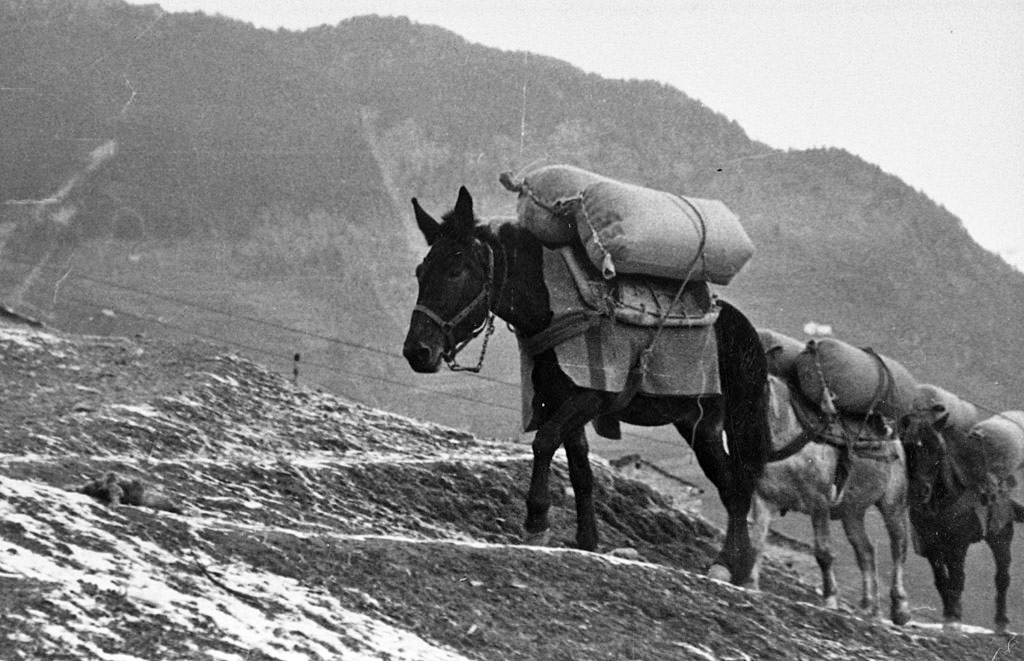Una colonna di muli con un carico di merce di contrabbando, Cavaione, 1959. (archivio fotografico Luigi Gisep, Poschiavo)