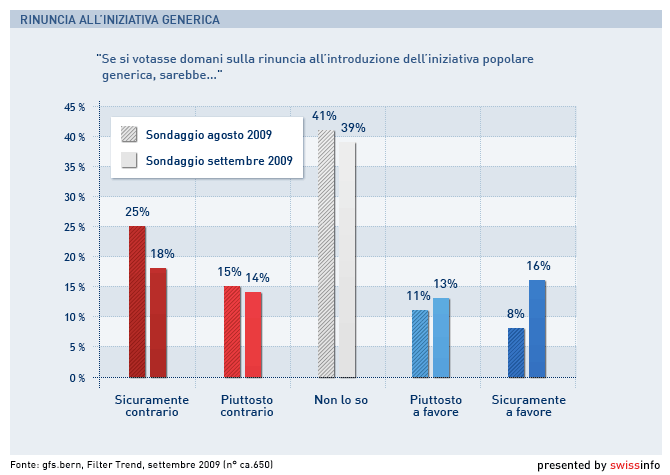 Diverso l’andamento per il secondo oggetto, ossia l’abolizione del diritto all’iniziativa popolare. Sostenuta da tutti i partiti, questa proposta è ora rifiutata dal 32% dagli intervistati intenzionati a votare e accettata dal 29%. Il campo degli oppositori è diminuito di 8 punti percentuali, mentre quello dei fautori è cresciuto di 10. A prevalere sono però ancora gli indecisi, che, con un tasso del 39% (-2 punti) rimangono a un livello da primato.
