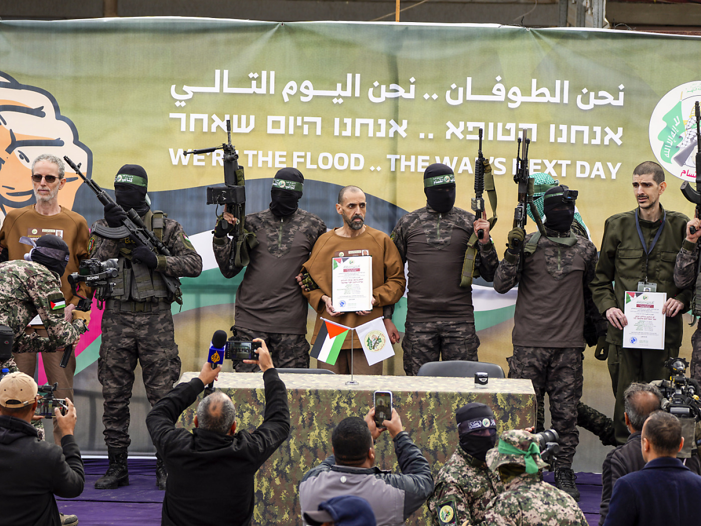 In precedenza gli ostaggi erano saliti sul palco allestito da Hamas, affiancati da miliziani armati e a volto coperto. Un funzionario della Croce Rossa e un funzionario di Hamas avevano poi firmato il documento per il rilascio.