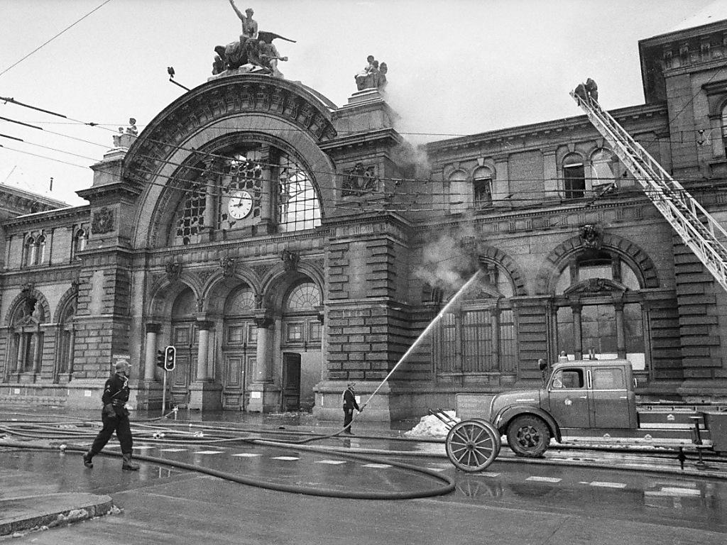 L’incendio divampò probabilmente durante lavori di saldatura. I pompieri non riuscirono a salvare l’edificio, costruito nel 1896, che venne quasi interamente distrutto. I lavori di pianificazione e ricostruzione durarono per due decenni, periodo durante il quale la struttura provvisoria era priva dei servizi che a quel tempo erano solitamente offerti ai viaggiatori, come WC e buffet.