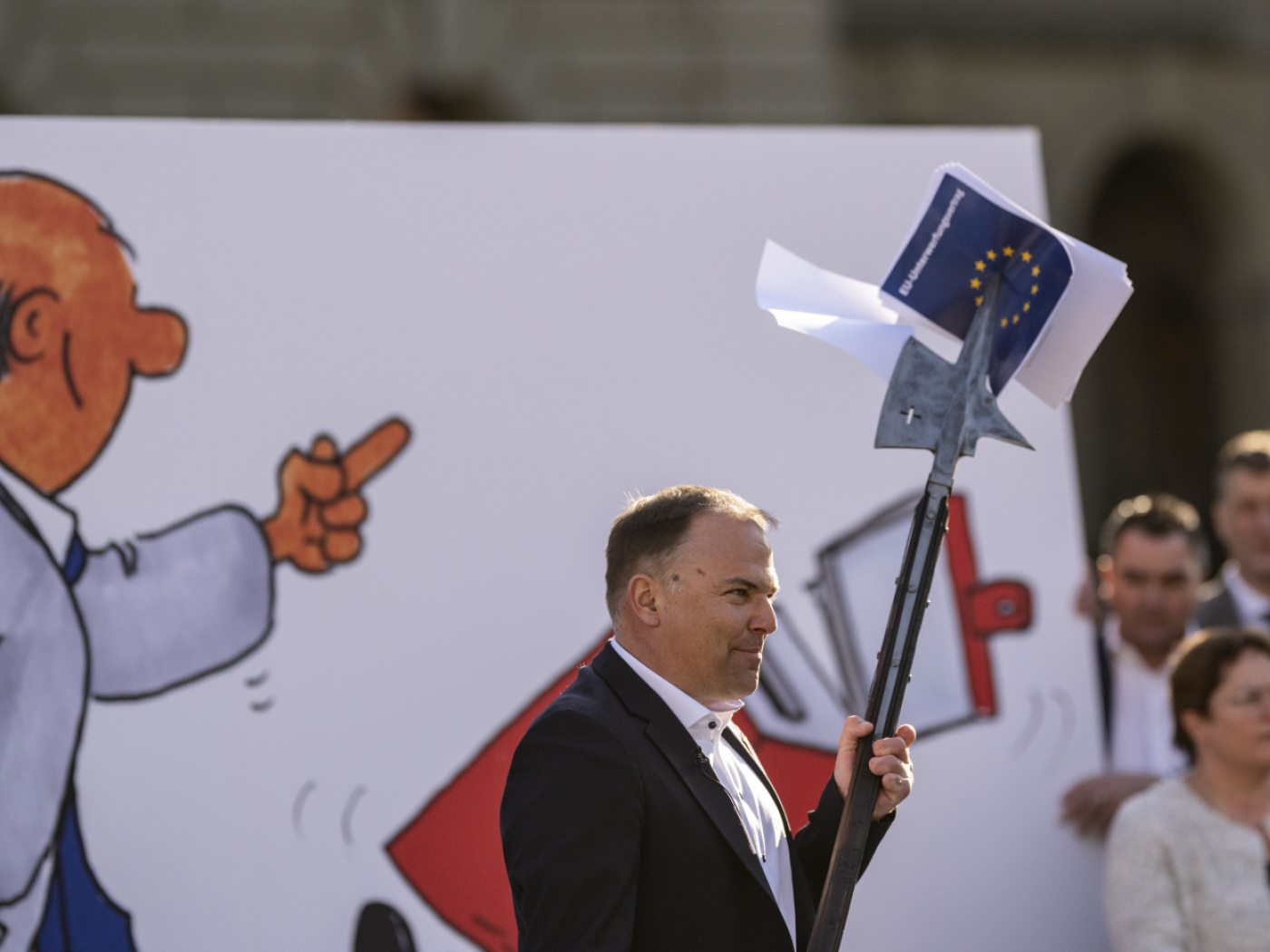 In un invito alla manifestazione fatto pervenire a Keystone-ATS, l’UDC afferma che il Consiglio federale sta violando i “diritti democratici popolari”. In una caricatura esposta sulla Piazza federale, il governo federale era raffigurato come una persona che mostra il dito medio a un’urna per il voto popolare.