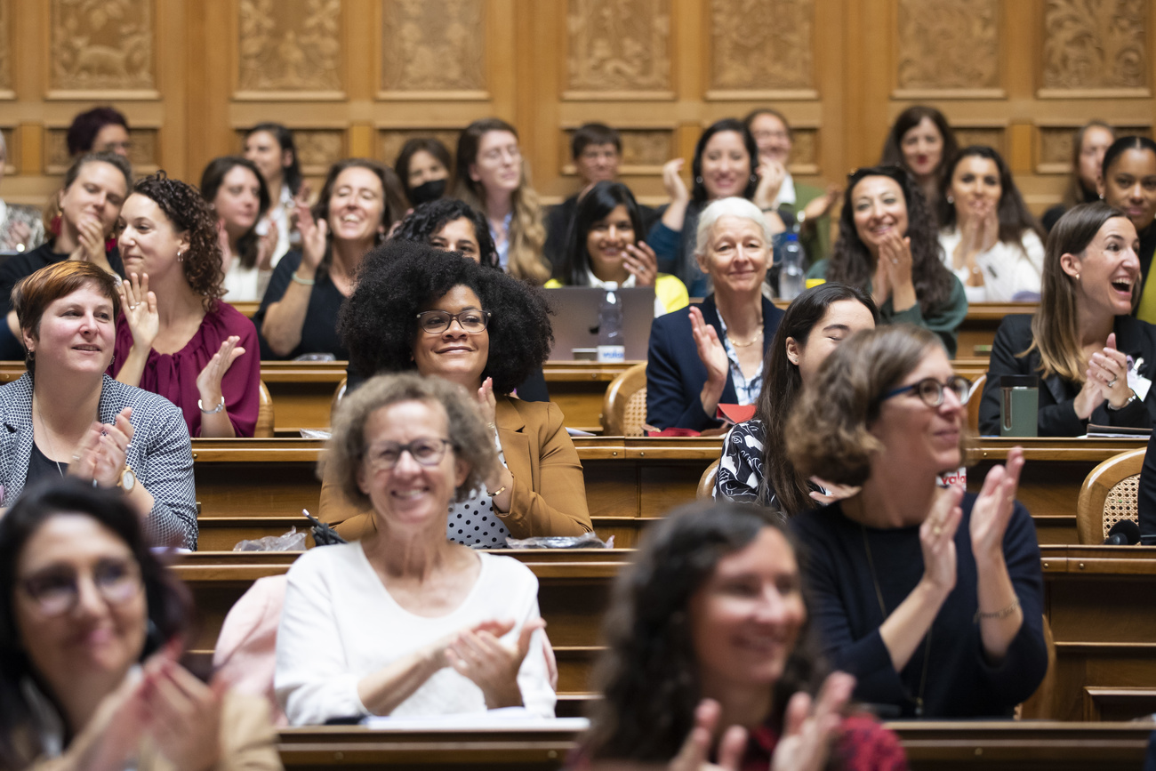 Nel 2021, in occasione del 50esimo anniversario del voto sul suffragio femminile, la sala del Consiglio nazionale ha accolto una sessione delle donne. KEYSTONE/Peter Klaunzer