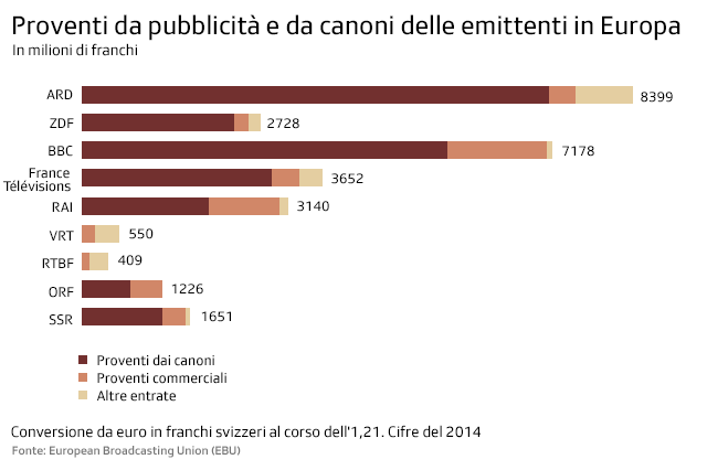 Il fatturato annuo della SSR è di circa 1,6 miliardi di franchi. Con questo bilancio, la SSR gestisce 17 reti radiofoniche e 7 televisive nelle quattro lingue nazionali, ossia tedesco, francese, italiano e romancio. Gli introiti sono principalmente destinati al finanziamento dei programmi radiofonici e televisivi. Una parte del canone va anche ad emittenti radiofoniche e televisive private.