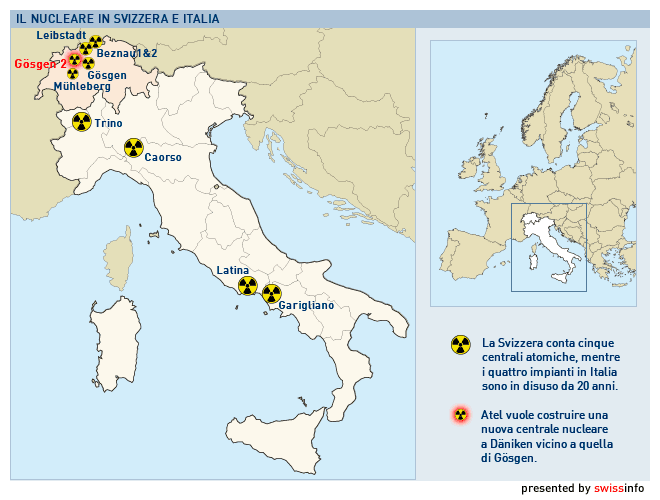 Il governo Berlusconi intende rimettersi sulla via del nucleare con la costruzione di nuove centrali. Una politica energetica sulla quale puntano anche altri Stati europei, Svizzera inclusa. Martedì, la società elvetica ATEL ha presentato una richiesta per la costruzione di un impianto nel canton Soletta.