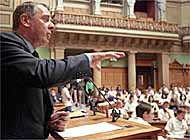 Il sistema politico elvetico è forse «complicato e lento», ma è prima di tutto una democrazia: una democrazia col punto esclamativo e non interrogativo, ha precisato il presidente della Confederazione. Ogi ha anche spiegato di aver approfittato dei viaggi all’estero, compiuti nella veste di presidente, per illustrare al mondo che «Svizzera e democrazia» sono un binomio inscindibile.