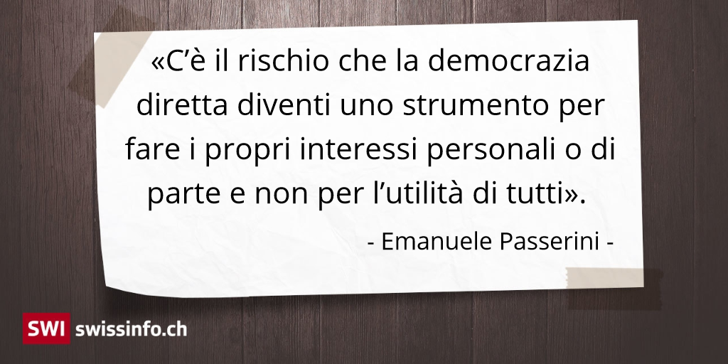 La democrazia diretta comporta dunque anche dei rischi, secondo Emanuele Passerini, cittadino italiano da sei anni in Svizzera. «Se la gente ha uno spirito critico e una coscienza civile, allora ci si può fidare a fare un referendum che cambi qualcosa anche di importante. Ma in Italia c’è troppa manipolazione dei media e pochissimo spirito critico nelle persone, che preferiscono rimbambirsi davanti alla TV e considerare solo il proprio orticello, piuttosto che pensare a delle riforme serie fatte insieme con sacrificio.