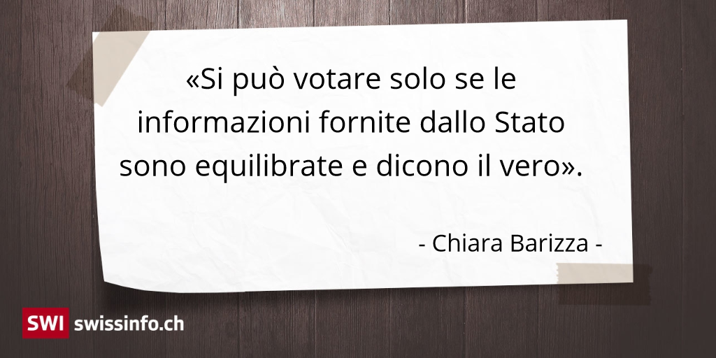 «La democrazia diretta prevede la migliore qualità di informazione pubblica possibile da fonti democratiche e attendibili», afferma Chiara Barizza. «Si può votare solo se le informazioni dallo Stato sono equilibrate e dicono il vero (…). In questo momento l’informazione in Italia non garantisce un equilibrio tale dell’informazione pubblica (…). Non ci sono le premesse per garantire una giusta democrazia diretta».