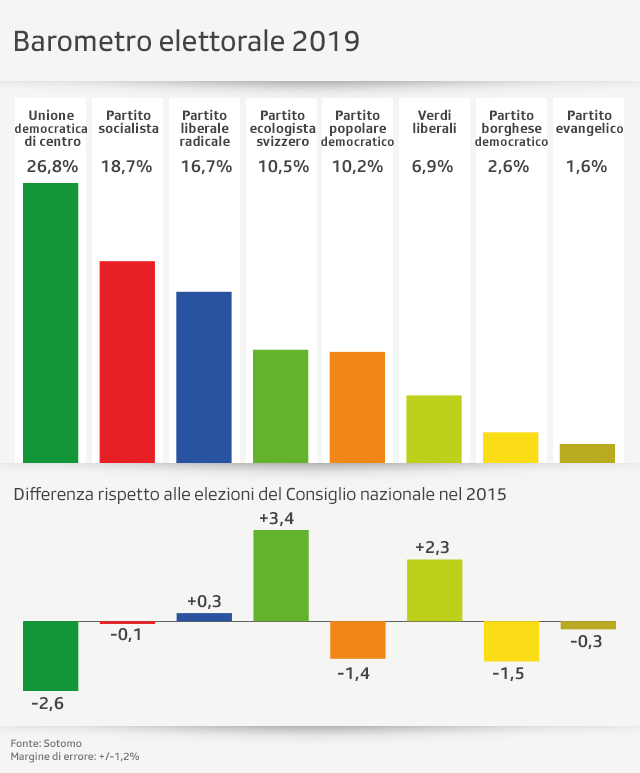 L’UDC è il partito che registra le perdite più consistenti, con una diminuzione del 2,6% delle intenzioni di voto rispetto al risultato del 2015. Il partito rimane tuttavia in testa: il sondaggio gli attesta il 26,8% delle preferenze. “L’UDC non è al momento nella sua forma migliore, ma rimane di gran lunga il partito più forte e perde attualmente meno di un decimo del suo elettorato”, sottolinea Sotomo.