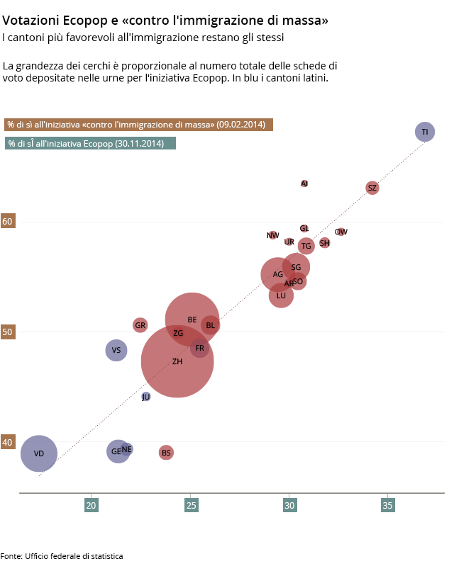 Dopo lo choc causato il 9 febbraio scorso dall’accettazione dell’iniziativa dell’Unione democratica di centro «contro l’immigrazione di massa», la votazione sul testo di Ecopop «contro la sovrappopolazione», che mirava anche a limitare l’immigrazione, era molto attesa. Questa iniziativa, combattuta da praticamente tutta la classe politica, è stata respinta da tre votanti su quattro e dalla totalità dei cantoni. Cionondimeno si può constatare che i cantoni più favorevoli a una maggiore regolamentazione dell’immigrazione restano gli stessi, come si può vedere dal grafico seguente.