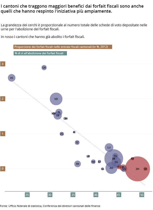 Domenica il popolo svizzero ha anche rifiutato con una proporzione del 59% l’ iniziativa per l’abolizione dei forfait fiscali. Oltre a un ‘no’ quasi unanime dei cantoni, si può osservare che sono quelli che guadagnano maggiormente grazie a questo sistema d’imposizione che hanno rifiutato l’abolizione in modo più chiaro. Il grafico seguente illustra questa tendenza mostrando la proporzione dei forfait nelle entrate fiscali cantonali totali (nel 2012) e la percentuale di sì all’iniziativa.