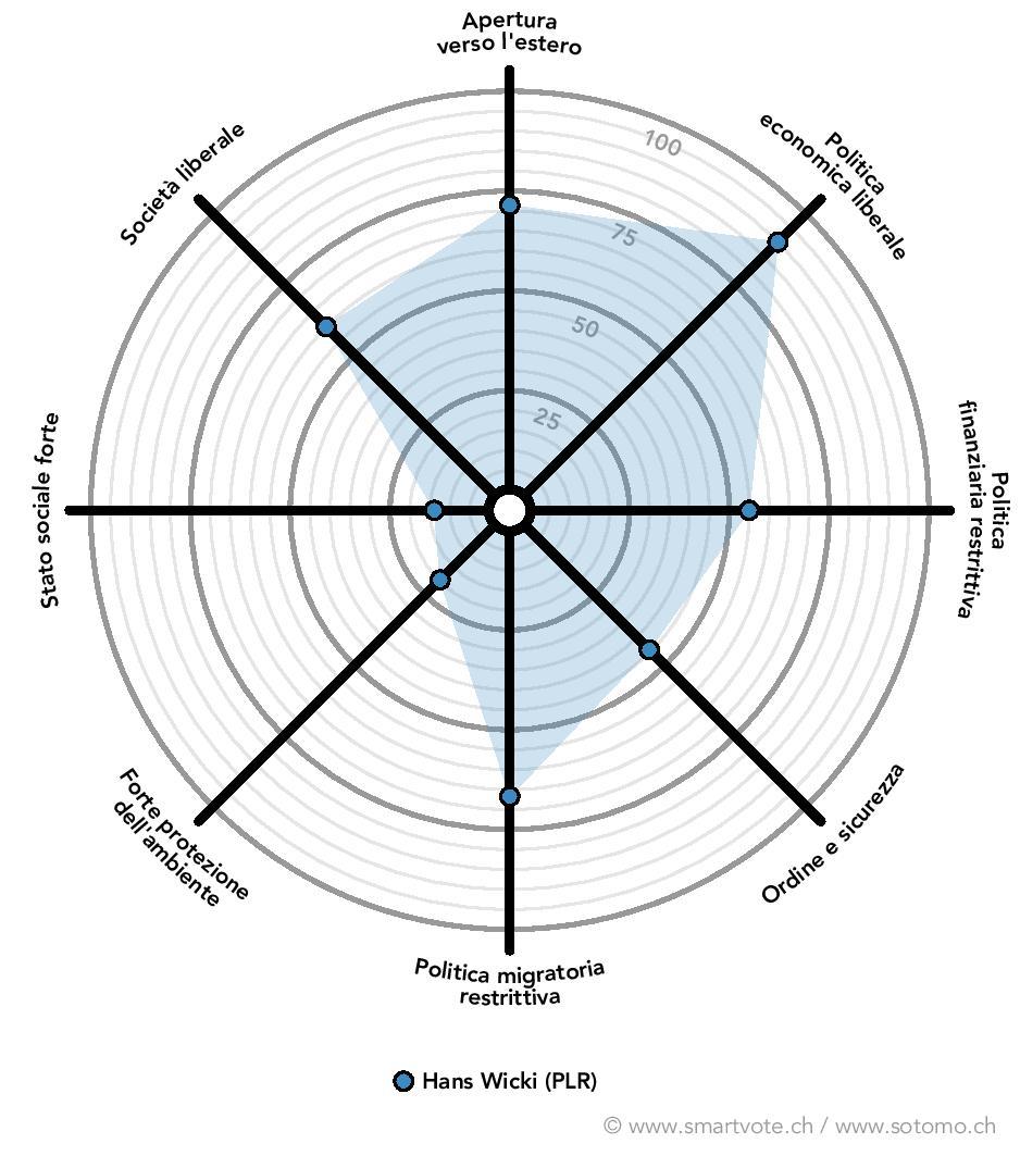 Hans Wicki ha un profilo chiaramente liberale. Secondo i dati immessi in smartvote nel 2015 in vista delle elezioni federali, è contrario al congedo paternità e a una totale trasparenza nel finanziamento dei partiti politici. Si schiera piuttosto contro l’adozione per le coppie omossessuali mentre è piuttosto favorevole alla naturalizzazione agevolata per gli stranieri di terza generazione e sostiene inoltre l’irrigidimento delle norme per l’acquisto e la detenzione di armi come pure la liberalizzazione degli orari di vendita dei negozi.
