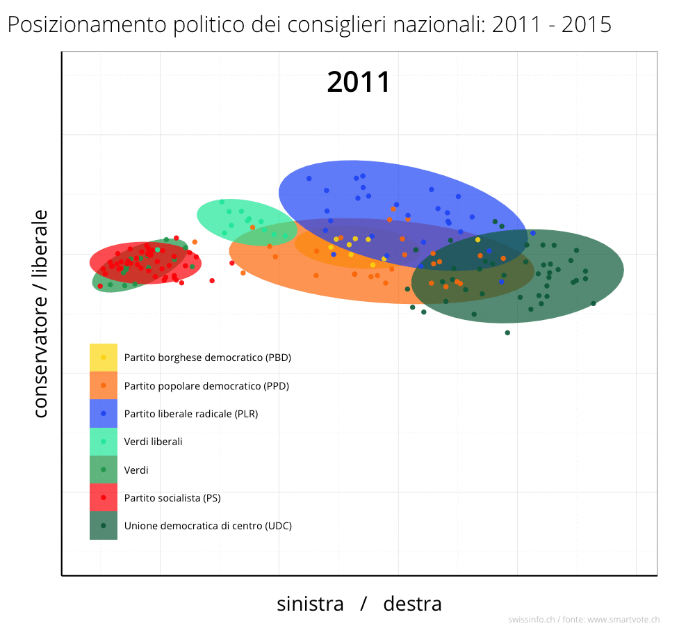 I ricercatori di smartvote.ch hanno fornito a swissinfo.ch una serie di 35 domande ai quali i consiglieri nazionali hanno risposto nel 2011 e nel 2015. Smartvote ha calcolato il posizionamento di ogni consigliere nazionale. Per saperne si può consultare questo articoloCollegamento esterno o quest’altroCollegamento esterno.