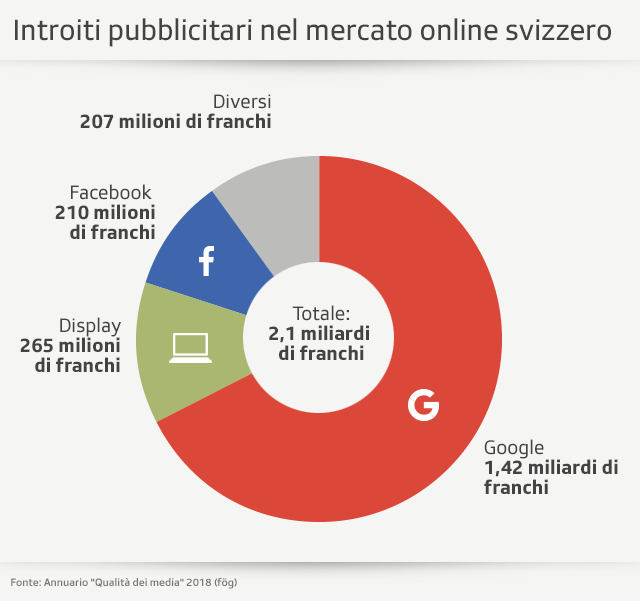 L’Annuario “Qualità dei media” 2018Collegamento esterno rileva che intermediari tecnologici internazionali come Google e Facebook dominano il mercato della pubblicità online nella Confederazione. Di conseguenza, si intensifica la concentrazione dei media svizzeri. Questi sono ormai nelle mani di un numero sempre più ristretto di editori.