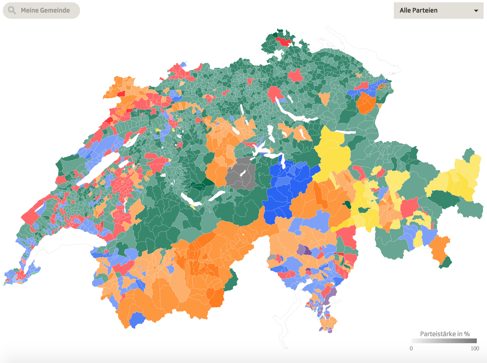 I tempi in cui un comune era compatto dietro a una bandiera partitica sono generalmente finiti. Sopravvivono però alcune eccezioni, in particolare nelle zone rurali montane dove alcuni partiti hanno roccaforti nelle quali raccolgono l’80%. È il caso: del distretto di Leuk in Vallese per il PPD, il canton Uri per il PLR e il sud dell’Emmental per l’UDC.