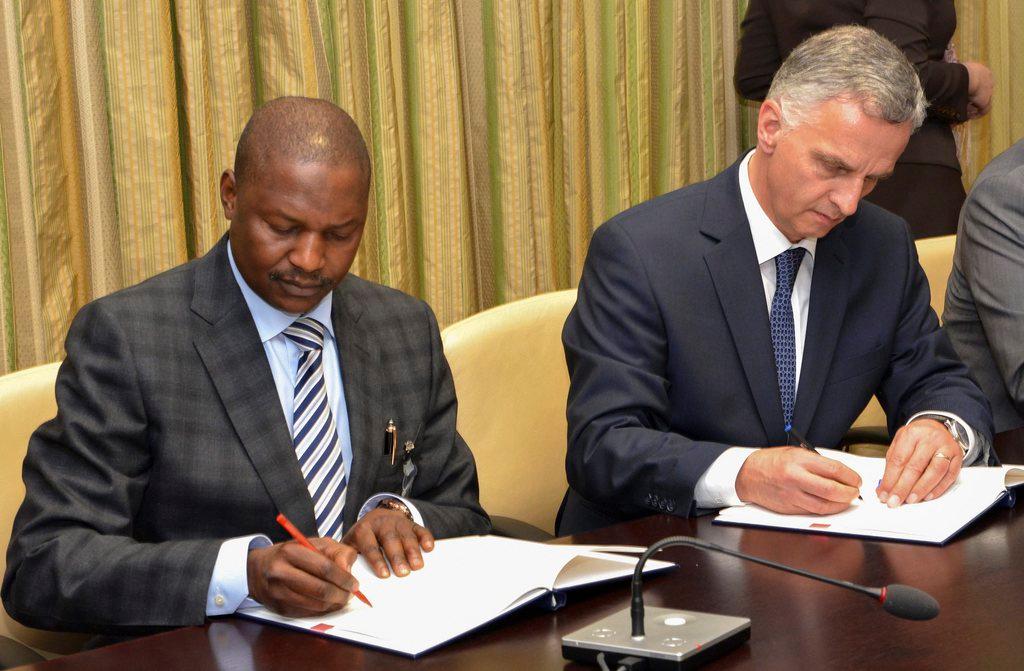 Didier Burkhalter e Abubakar Malami hanno firmato martedì la lettera d'intenti che dovrebbe permettere alle autorità nigeriane di rientrare in possesso di 321 milioni di franchi. Keystone