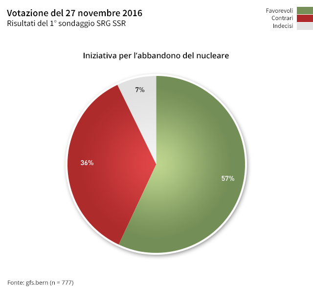 In favore dell’iniziativa “Per un abbandono pianificato dell’energia nucleare (Iniziativa per l’abbandono del nucleareCollegamento esterno)” si schiera il 57% del campione rappresentativo di aventi diritto di voto intervistati per l’inchiesta demoscopica dell’istitutoCollegamento esterno di ricerca bernese, condotta su mandato della Società svizzera di radiotelevisione (SSR). Il 36% invece si oppone e il 7% non ha ancora un’opinione in materia.