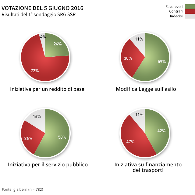 No alle iniziative popolari sul reddito di base incondizionato e sul finanziamento dei trasporti, sì a quella sul servizio pubblico e alla revisione della legge sull’asilo: sono le maggioranze uscite dal 1° sondaggio SSR su quattro oggetti in votazione il 5 giugno in Svizzera. Ma solo per il reddito di base il destino è già segnato.