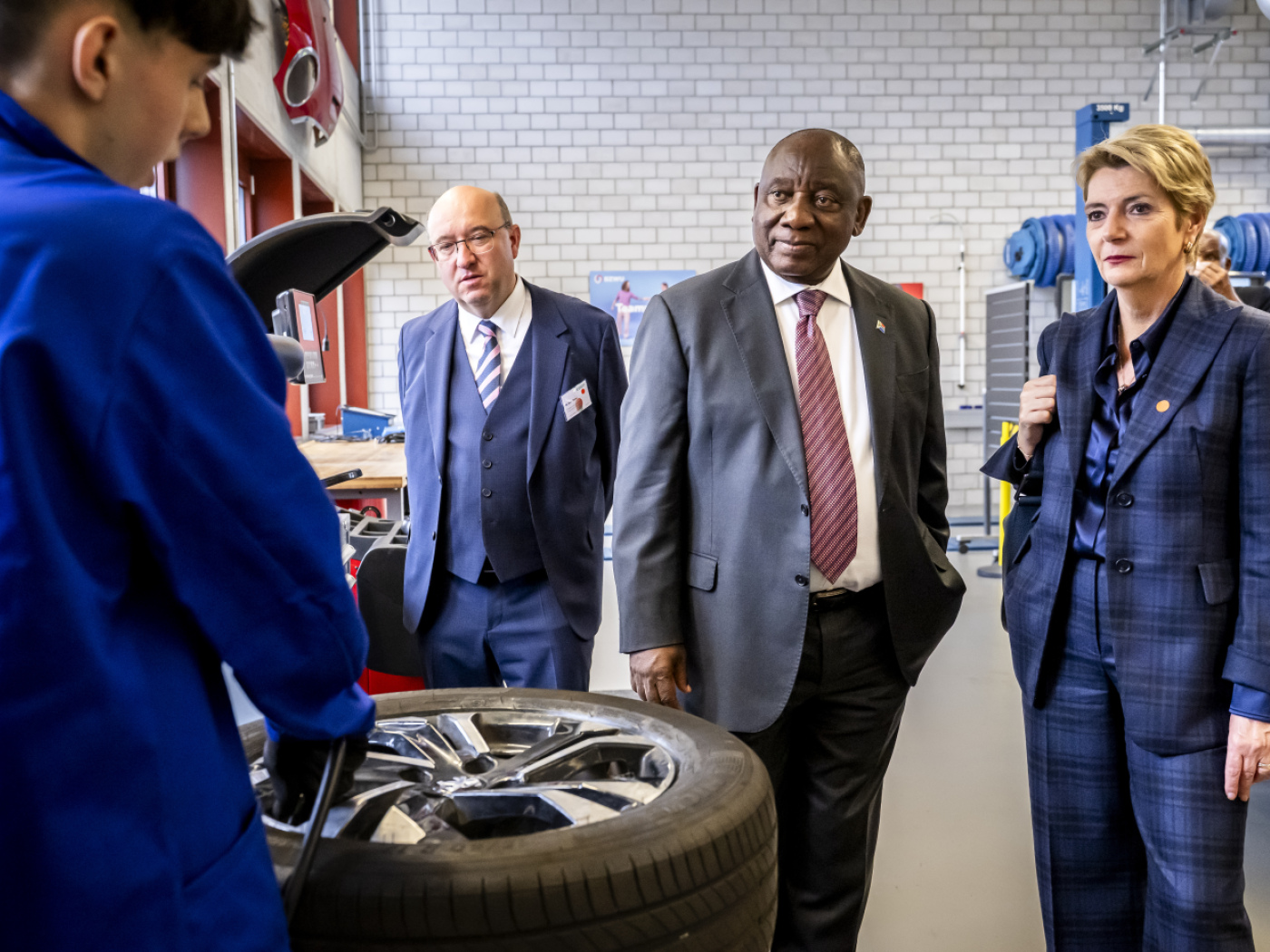 Visita nella Svizzera orientale oggi per il presidente sudafricano Cyril Ramaphosa. Insieme alla presidente della Confederazione Karin Keller-Sutter si è recato in un centro di formazione professionale e in un'azienda a Uzwil (SG), prima di spostarsi a Turgovia.