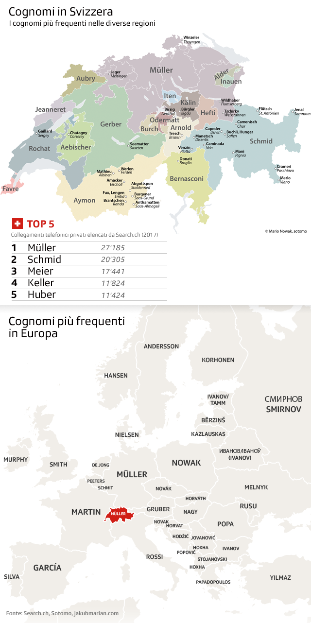 In Svizzera si è riaccesa la polemica sui cognomi, dopo che nel fine settimana è emerso che ad alcuni dipendenti di origine straniera di un call center è stato consigliato di usare uno pseudonimo più “svizzero”. swissinfo.ch getta uno sguardo sui cognomi più frequenti nel paese.