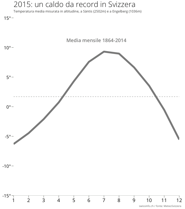 2015 è stato uno degli anni più caldi in Svizzera e nel mondo. Dopo un’estate particolarmente torrida, la Svizzera non aveva mai conosciuto un mese di dicembre così mite. Illustrazione del fenomeno sulla base di oltre 150 anni di rilevamenti meteorologici.
