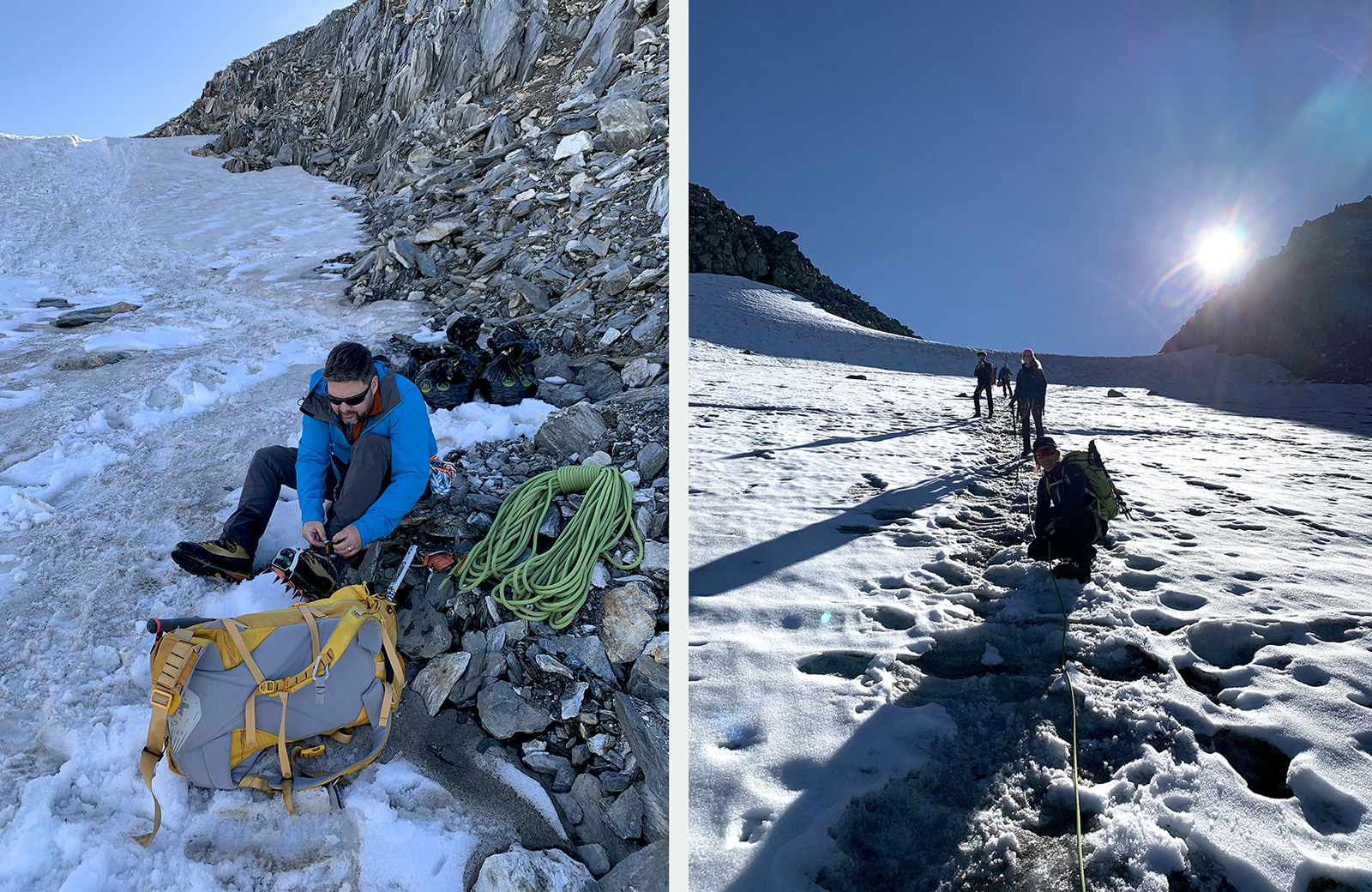 Il sole si fa sempre più basso all’orizzonte e anche la temperatura cala: è ora di andare. Calziamo i ramponi e ci leghiamo di nuovo in cordata. Sotto i nostri piedi, l’acqua di fusione del ghiacciaio continua a gorgogliare: è un suono allegro, ma serve anche a ricordarci dei cambiamenti a cui è soggetto il paesaggio che ci circonda. Tra il 1973 e il 2010, il ghiacciaio del Brunnifirn ha perso quasi un quarto della propria massa, riducendosi da 3,02 km2 a 2,31 km2Collegamento esterno. Dall’altro lato del ghiacciaio, a 2’649 metri di altitudine, ci attendono la cena e i letti a castello della capanna Cavardiras.