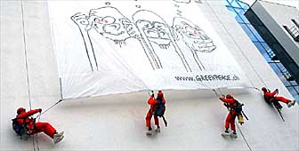 Attivisti di Greenpeace hanno esposto venerdì a Berna uno striscione con tre grandi «scimmiette cinesi» – «non vedo, non sento, non parlo» – sulla facciata della sede dell’ufficio federale, accusato di non aver reagito ai «nuovi allarmanti studi» sulla soia Monsanto.