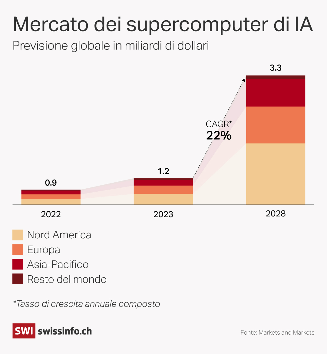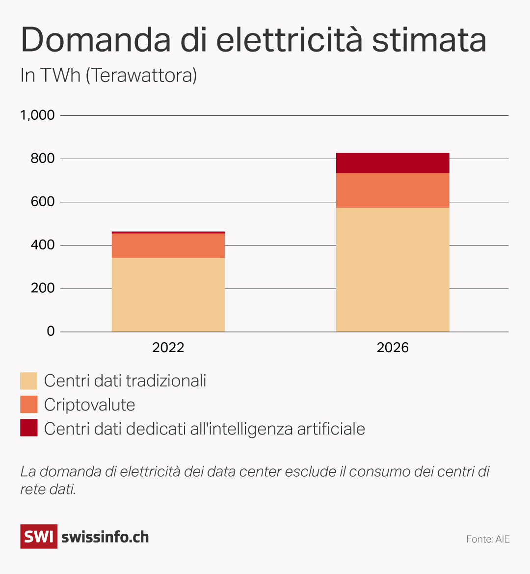 Anche Sam Altman, CEO di OpenAI – l’azienda dietro ChatGPT – ha affermato al Forum economico mondiale dello scorso anno a Davos che sarà necessaria “una rivoluzione energetica” per sostenere l’espansione degli strumenti di IA generativa, che producono testi, immagini o audio. Con quasi 4 miliardi di visite mensili, ChatGPT consuma già tanta energia quanto 33’000 famiglie e il 6% dell’acquaCollegamento esterno – utilizzata per raffreddare i suoi server – del distretto statunitense dove si trova il suo centro di dati.