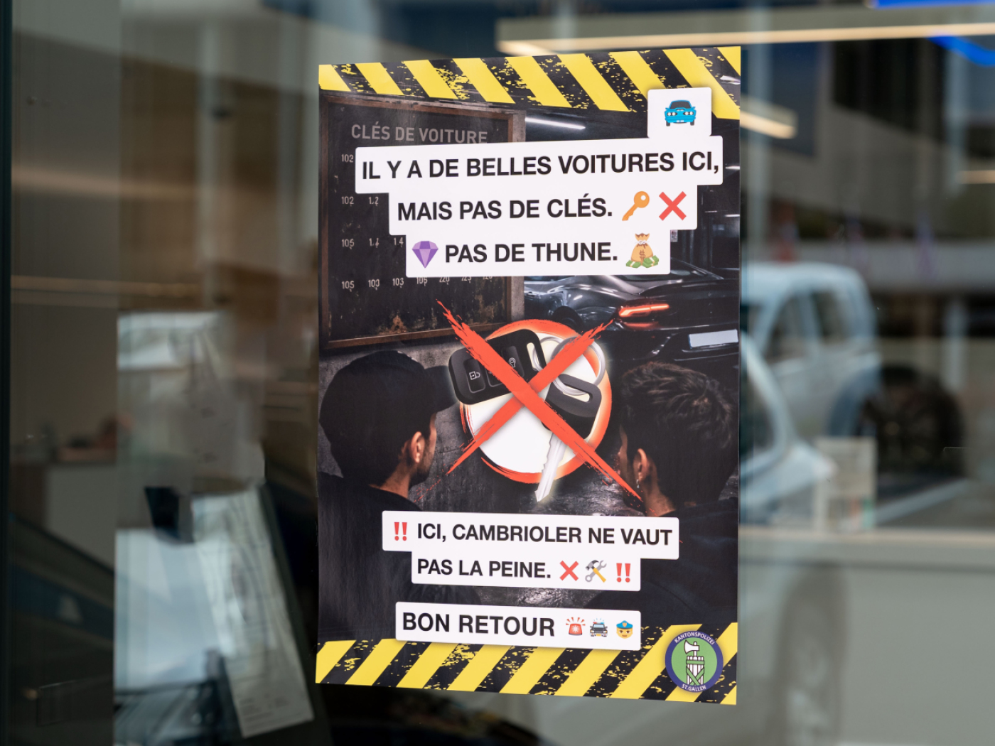 La polizia di San Gallo ha apposto manifesti presso le officine che ora custodiscono le chiavi delle auto in modo sicuro. Contenuto e design di questi messaggi si ispirano ai post sui social media con cui i giovani vengono avviati sulla via del crimine. “I manifesti si rivolgono direttamente ai malviventi in francese e contrappongono in modo mirato al messaggio dei mandanti un messaggio della polizia cantonale di San Gallo”, sottolinea la cantonale.
