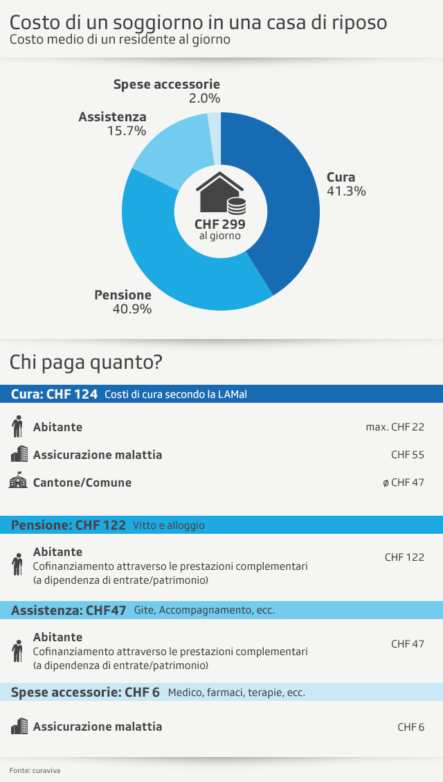 Paradossalmente, però, le persone anziane che si trovano in condizioni economiche peggiori sono costrette a entrare in una casa di riposo, anche se non è strettamente necessario: “Chi non ha parenti che possono aiutare nella vita quotidiana e troppo poco denaro per potersi pagare il sostegno domestico, ad esempio per far la spesa, le pulizie o la cucina, spesso deve trasferirsi in una casa per anziani, anche se la persona interessata non ha bisogno di cure”. Lo afferma Judith Bucher di Pro SenectuteCollegamento esterno. Per le casse malati è più conveniente poter fatturare i pazienti in regime di ricovero, perché in questo caso i Cantoni partecipano in modo importante ai costi.