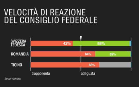 Divergenze tra le regioni linguistiche appaiono anche nella fiducia riposta nelle autorità elvetiche: circa il 70% dei partecipanti al sondaggio della Svizzera tedescofona ha dichiarato di avere fiducia, contro solo il 45% nella Svizzera italofona e francofona.
