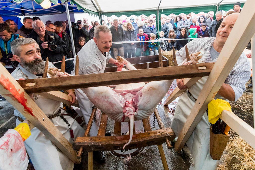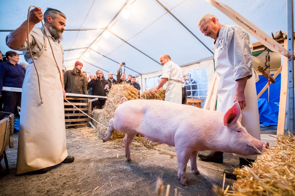 Un macellaio mostra come si macella un maiale secondo la tradizione. @ KEYSTONE / CHRISTIAN MERZ