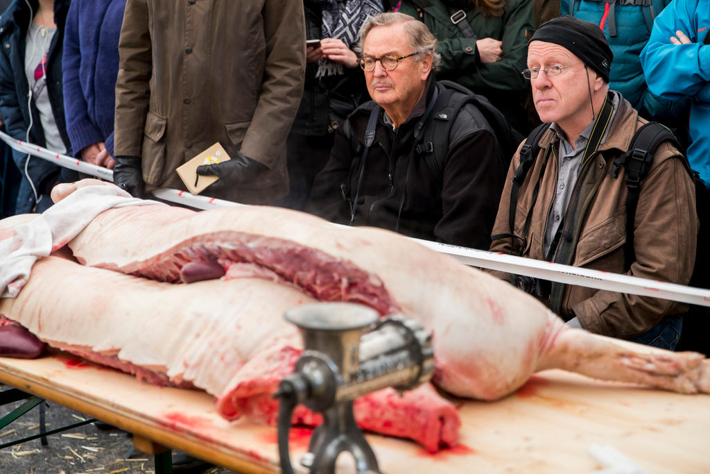 Nel frattempo dalla corte sale del fumo. C’è odore di capelli bruciati. L’animale è ora steso su un tavolaccio di legno. Il macellaio Rolf Häring ha in mano un bruciatore. Due uomini raschiano il corpo con piccoli attrezzi, per togliere le setole più grosse. Rolf Häring passa con la fiamma arancione sopra la pelle dell’animale, brucia i peli rimanenti. Poi l’animale viene aperto con un coltello affilato, ripulito delle interiora, appeso, in modo che i resti di sangue gocciolino dai fasci di muscoli.