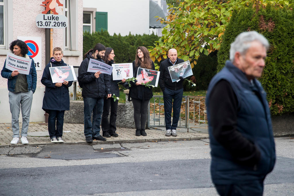 La macellazione pubblica a Sissach ha suscitato curiosità e indignazione. @ KEYSTONE / CHRISTIAN MERZ