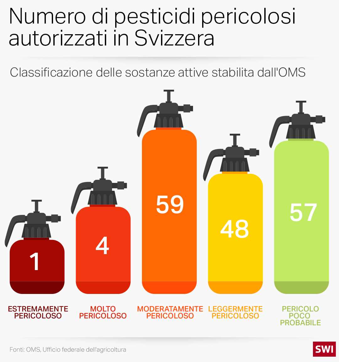 La Svizzera può essere “nella media con margine di miglioramento” in un contesto globale, ma cosa significa questo per la sua popolazione? I profili di tossicità dei pesticidi rientrano in un ampio spettro e l’Organizzazione Mondiale della Sanità (OMS) li ha recentemente classificati in base al loro potenziale di danno per l’uomo. Quando abbiamo incrociato la classificazione di pericolo dell’OMS con una lista di 360 sostanze attive approvate in Svizzera, l’analisi ha rivelato la presenza di un pesticida che l’OMS classifica come “estremamente pericoloso”: l’agente attivo bromadiolone, venduto in Svizzera con il nome commerciale Arvicolon 200 CT. Diversi altri pesticidi rientravano nelle categorie “moderatamente pericoloso” e “leggermente pericoloso”.
