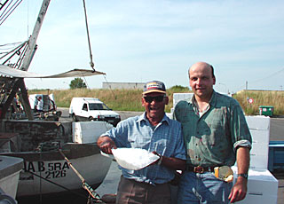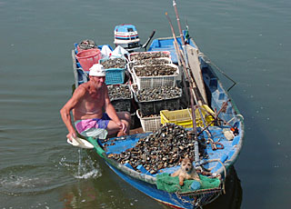 Un pescatore torna carico di vongole, che nell’acqua bassa trovano l’ambiente ideale per riprodursi coperte dalla sabbia. Solo la Cooperativa la Valle ne produce dalle 2 alle 3 tonnellate all’anno. In Tutte le Valli di Comacchio operano una settantina di cooperative.