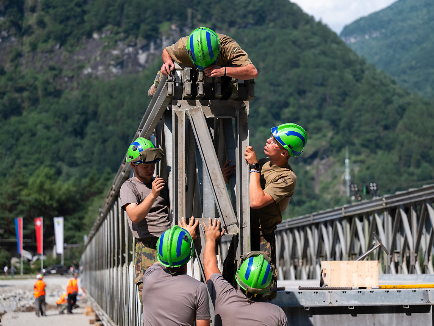 Alla costruzione, durata una settimana, hanno partecipato 35 militari del battaglione d’intervento d’aiuto in caso di catastrofe. Per terminare l’opera è stato necessario lavorare anche di notte, non da ultimo a causa delle temperature elevate.