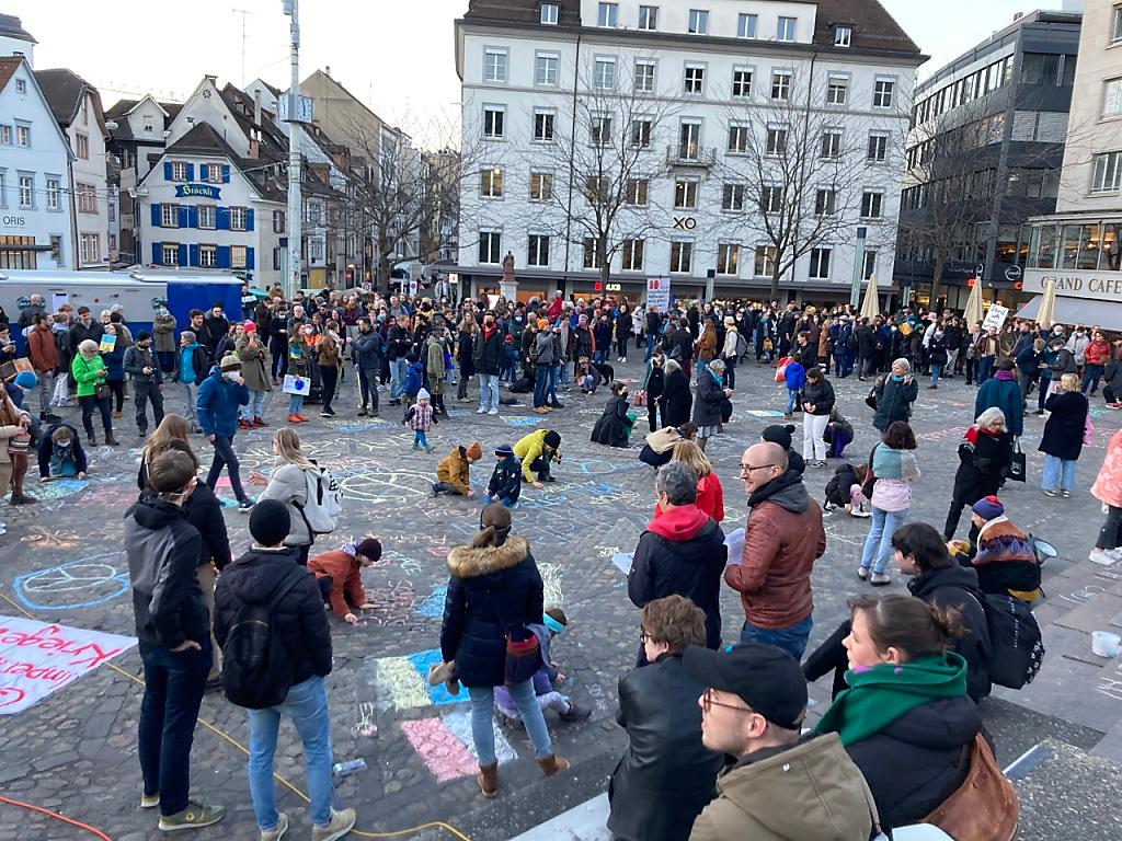 A Basilea, circa 400 persone – adulti e bambini – si sono radunate sulla Barfüsserplatz, nella città vecchia, e hanno disegnato una bandiera ucraina con il gesso nonché scritto slogan contro l’aggressione russa nel Paese vicino. La manifestazione è cominciata alle 17.45 e nei discorsi che sono seguiti è stato tra l’altro denunciato “l’empio legame” tra guerrafondai ed energie fossili.