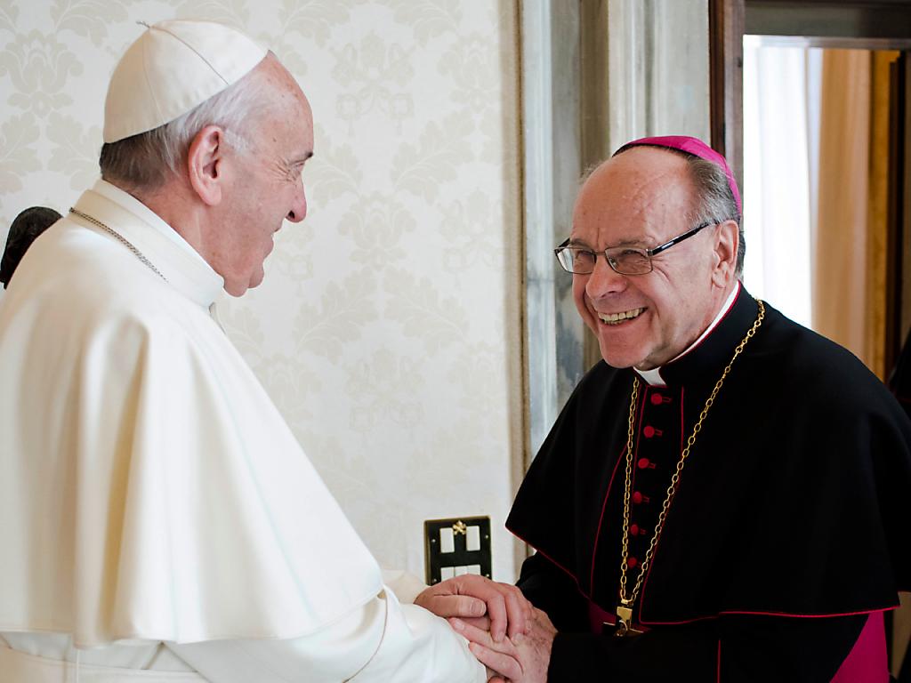 Scadono domenica prossima i due anni di proroga al mandato di Vitus Huonder (nella foto in presenza del Papa) quale vescovo di Coira. KEYSTONE/AP L'Osservatore Romano sda-ats