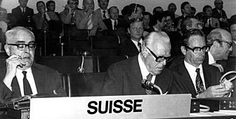 La delegazione svizzera ad Helsinki era guidata da Pierre Graber (al centro). Oggi l'OSCE è una delle due sole organizzazioni paneuropee di cui la Svizzera fa parte a pieno titolo Keystone