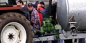 Contadini durante il blocco della centrale di distribuzione Coop a La Chaux-de-Fonds nel novembre 2001 Keystone Archive
