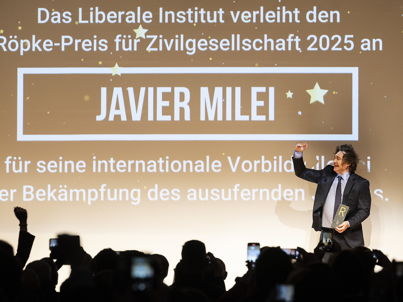 Il presidente argentino, l'ultraliberale Javier Milei, di ritorno dal Forum economico di Davos (WEF), ha fatto tappa al Centro Congressi di Kloten (ZH) dove gli è stato attribuito il Premio Röpke per la società civile 2025 dell’Istituto Liberale.