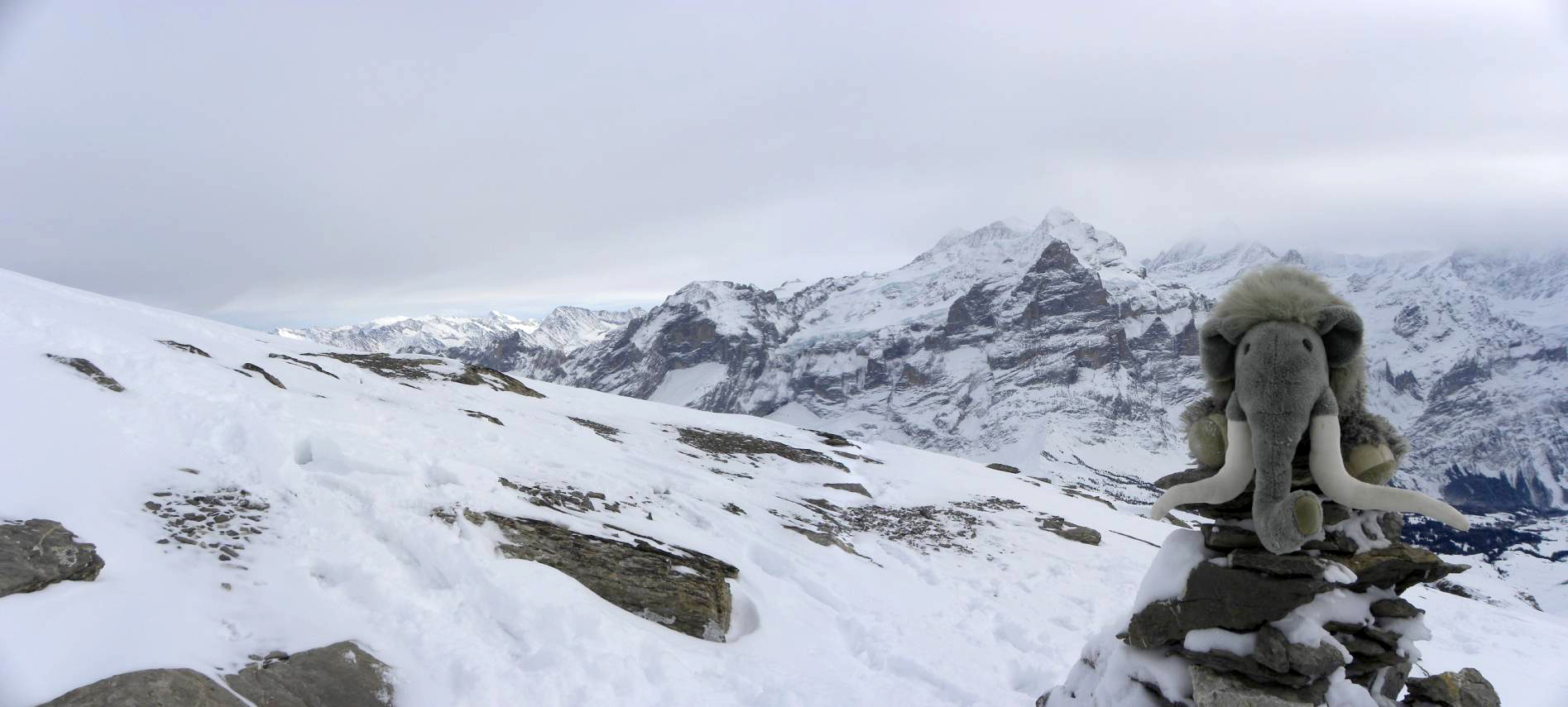 マンモスのマニーはベルン州のプレアルプスの最高峰、標高2929メートルのシュヴァルツホルン ( Schwarzhorn ) への登山を申し込んだ。1月のこの登山には、まもなく子どもへのプレゼントになる、「トラ」という名のユキヒョウも参加した。パーティを率いたのは登山家のイヴォンヌさんだ。