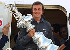 アメリカズ杯の優勝カップを持ち上げ、飛行機から降りるアリンギのスポンサー、ベルタレッリ氏。 Keystone