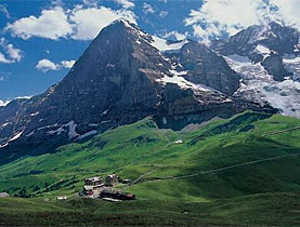 クライネシャイデックの向こうにアイガーとメンヒを望む。村から登山の様子が観察でき、登山者と村人が一体となって冒険を体験できるのがアイガーの特徴 swiss-image