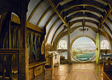 ファンタジー作家トールキンの傑作「指輪物語」の映画を手掛けたピーター・ジャクソン監督の3部作「ロード・オブ・ザ・リング」を見た人はホウ氏の絵の世界が映画そのものでびっくりする。共同制作者のアラン・リー氏と共に映画のセット、登場人物のコスチュームなどビジュアルなものを全て手掛けた。「指輪物語」は12歳の時から愛読書というが、完全にトールキンのファンタジーを自分のものに消化している。ホビットの室内からお城の情景や湖に聳え立つ彫刻まで映画を再現するようだ。