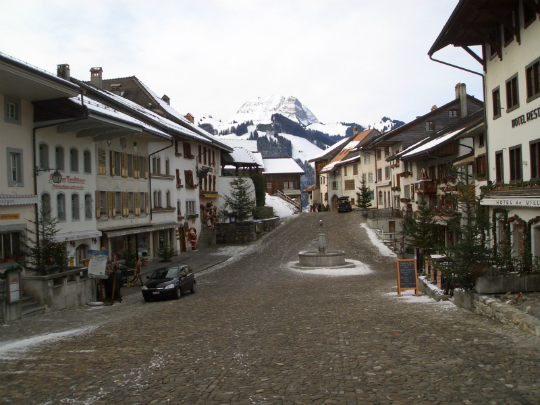 エメンタールチーズに並んでスイスを代表するグリュイエールチーズは、その名の通りフランス語圏グリュイエール村周辺で作られている。この村は長さ200m足らずの石畳のメインストリートが一本あるだけのとても静かな小さい村だ。夕暮れ時は控え目なクリスマスイルミネーションに灯がともりロマンティックな雰囲気。グリュイエールという名はフランス語で鶴を意味するグリュ(Gruef)に由来しており、鶴はこの村のシンボルにもなっているそうだ。村から車で10分ほど走ったところには、ガラス越しにチーズ作りが見学できるところもある。