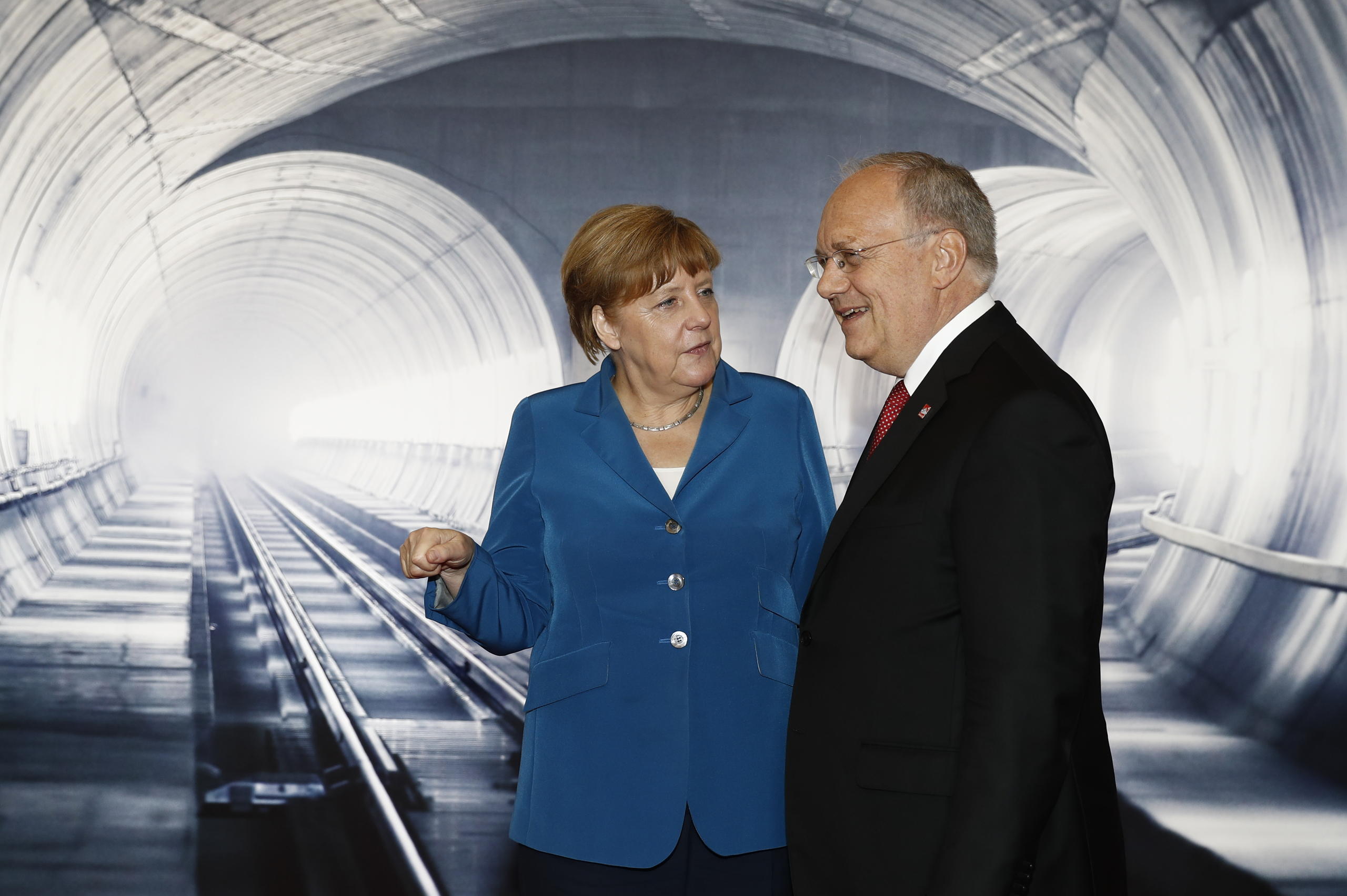 開通式に列席したスイスの大臣と隣国の首相や大統領、前列左からロイタルド運輸相、オランド仏大統領、スイスのシュナイダー・アマン大統領、メルケル独首相、マウラー財務相